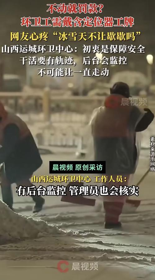 记者致电山西运城环卫中心,工作人员称,环卫工戴含定位器的工牌,一方面是保障安全,另一方面干活要有轨迹,确有时限要求,休息不能超过一定时间,后台有专人监控,片区管理员也会核实。“环卫工岁数比较大,不可能让他们一直走动,要考虑他们的体力,不存在一不动就罚款。”